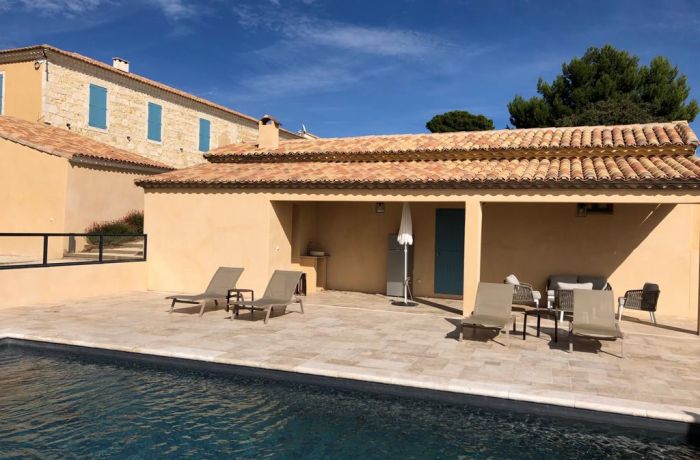 A l'extérieur, vous profitez d'un parc arboré, de deux grandes terrasses, d'une piscine privée chauffée (9m x 4m) ouverte d'avril à octobre, d'un salon de jardin, d'un pool house et d'un spa privé. Un terrain de pétanque complète les équipements pour des moments de détente.