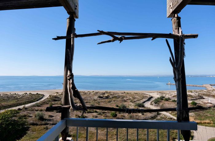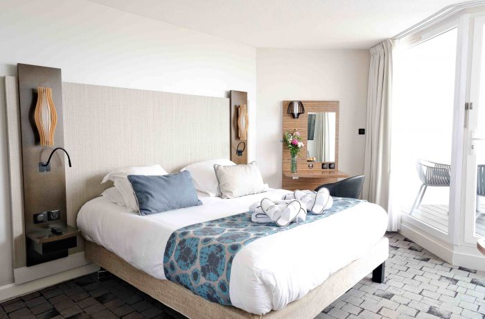 - Chambres Privilèges Mer (26 m2) : 1er au 5e étage, vue dégagée sur la baie d'Aigues-Mortes, grande terrasse avec transats, machine à café/thé, grand lit (200x200), avec accès à l'espace forme de 18h00 à 19h45.