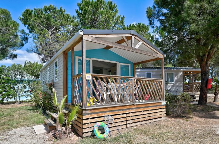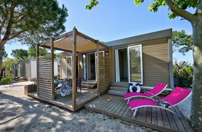 Location de mobil-homes, 8 modèles différents, confortables, modernes et design, équipés de terrasse couverte ou semi-couverte. Chaque mobil-home dispose d'une douche et wc séparés, télévision, le modèle Olivier dispose d’une chambre parentale qui offre un grand lit de 160×200 cm ainsi qu’un espace pour le lit bébé.