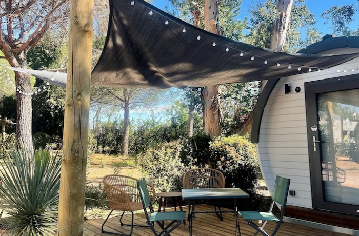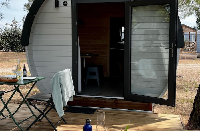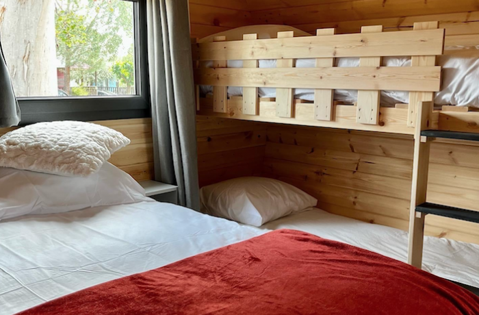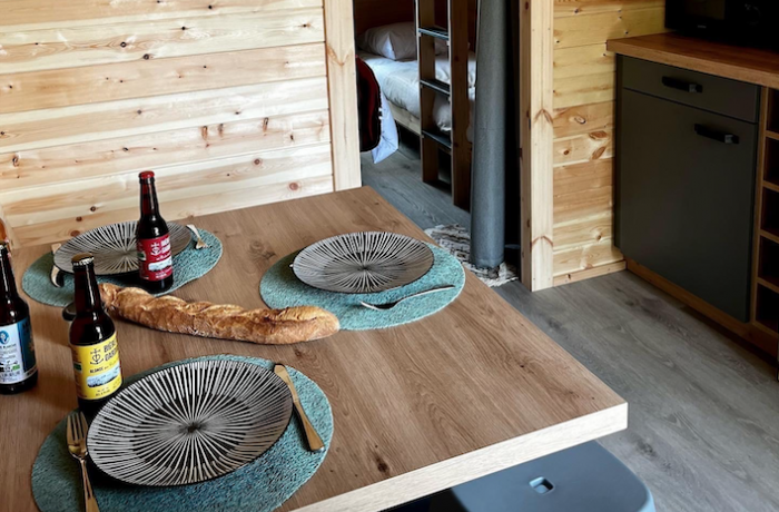 - Ecrin Cocoon et Coco Family : de 16 m2, pour 1 à 4 personnes, équipés d'une kitchenette et d'un kit électroménager, d'une chambre parentale avec lit double 140x190 cm et d'une séparation avec banquettes transformables en 2 lits simples de 80x190 cm ; les oreillers et couvertures sont fournis, draps en option. Sanitaires communs à proximité de votre logement. Terrasse et grand auvent.