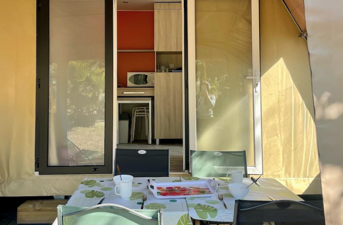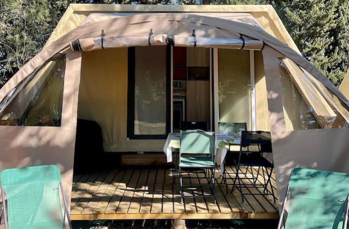 - Tente Lodge Safari : de 37 m2, pour 1 à 5 personnes, équipées d'une cuisine, d'une chambre parentale avec lit double 160x200 cm et d'une chambre avec 3 lits simples 80x190 cm. Les oreillers et couvertures sont fournis, draps en option. Sanitaires communs à proximité de votre logement. Terrasse et grand auvent.