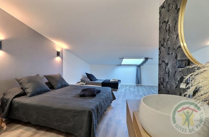 Deuxième étage : vaste chambre parentale avec lit double (160 cm) et lit simple (90 cm), accompagnée d'une salle d'eau privative avec douche à l'italienne et toilettes.