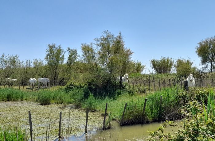 Prestations : visite confortable en petit train de la manade, avec démonstration du travail des gardians à cheval. Découverte des différents biotopes et élevages typiques de Camargue menés en agro-écologie.